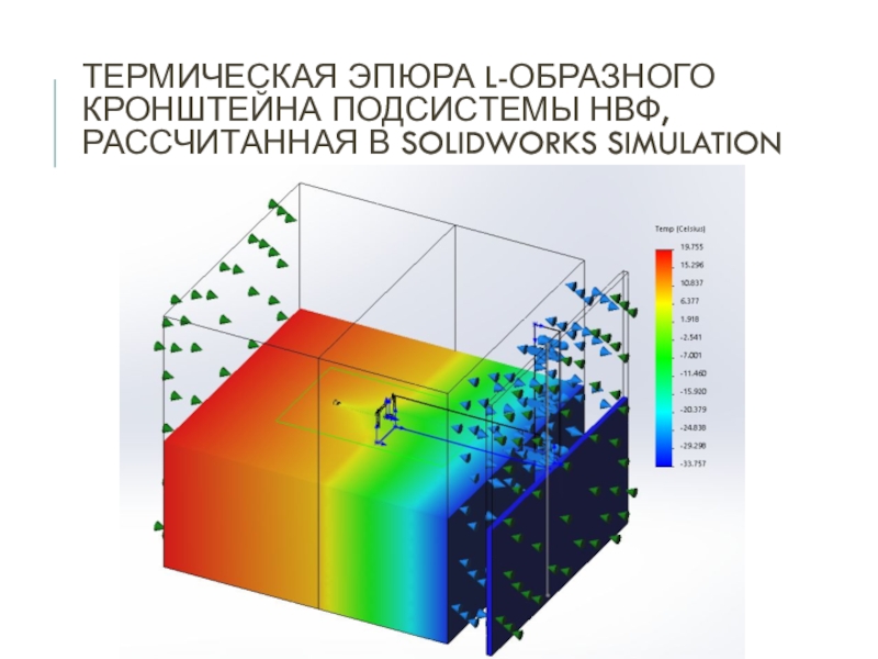 Слайд 26Термическая эпюра L-образного кронштейна подсистемы НВФ, рассчитанная в solidworks simulation