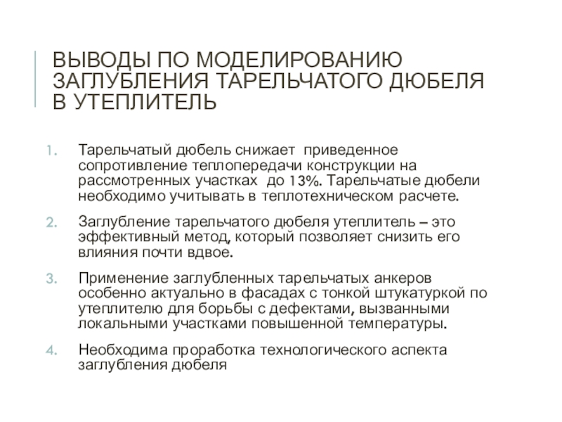 Слайд 23Выводы по моделированию заглубления тарельчатого дюбеля в утеплитель