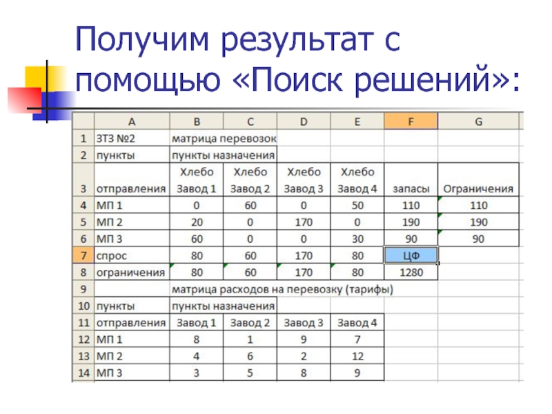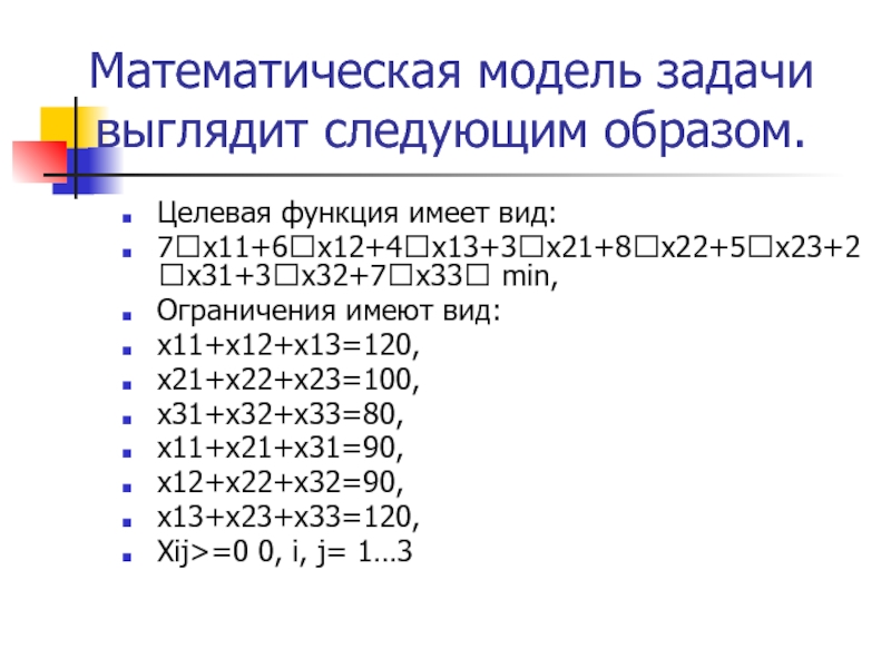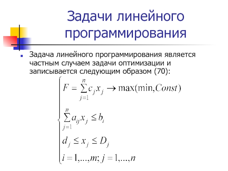 доход, если известно количество ресурсов (сырья, рабочего времени, оборудования) и цены, по которым можно реализовать готовые изделия. Другой вид задач – выяснить, при каких условиях свести расходы к минимуму (это, например, задача о питании). Таким образом, общая задача линейного программирования – это задача, в которой требуется найти максимум или минимум (оптимум) функции, называемой функцией цели, при ограничениях, заданных системой линейных неравенств или уравнений.При этом переменные чаще всего по условиям задачи должны принимать неотрицательные значения (то есть положительные либо нулевые), но бывают и исключения, о которых чуть ниже.