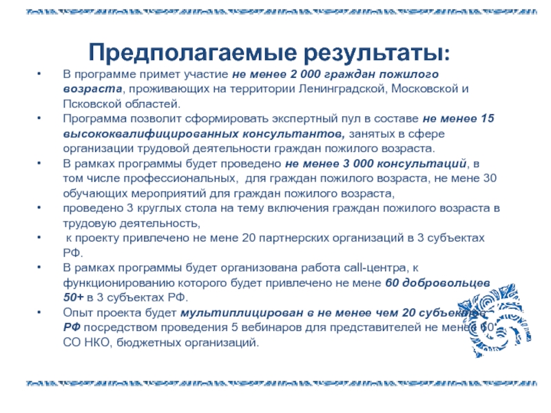 В рамках программы будет проведено не менее 3 000 консультаций, в том числе профессиональных, для граждан пожилого возраста, не мене 30 обучающих мероприятий для граждан пожилого возраста,