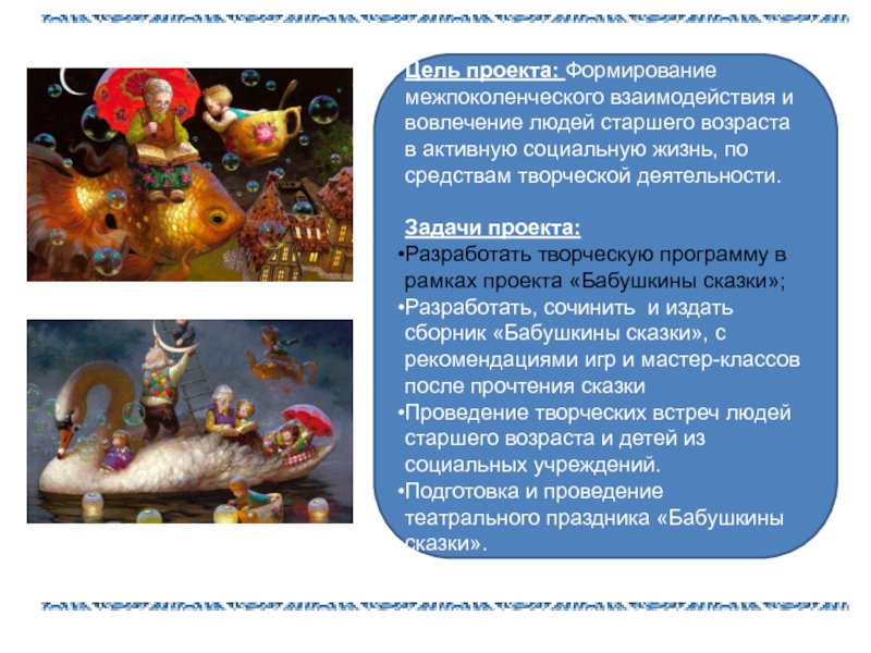 возраста (сочинение людьми старшего возраста сказок; прочтение в игровой форме сказок детям, иллюстрирование детьми сюжета сказок, проведение мастер- классов по изготовление куколок персонажей сказок, проведение трех театральных праздников и подведение итогов проекта) с детьми из социальных учреждений.