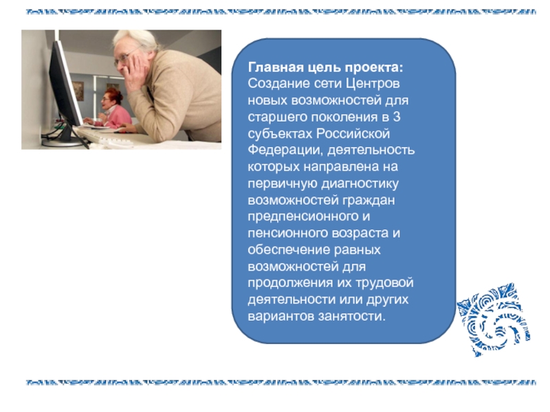 первичную диагностику возможностей граждан предпенсионного и пенсионного возраста и обеспечение равных возможностей для продолжения их трудовой деятельности или других вариантов занятости.