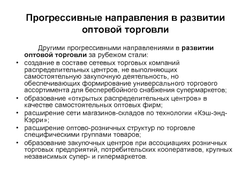 Слайд 63Прогрессивные направления в развитии оптовой торговли