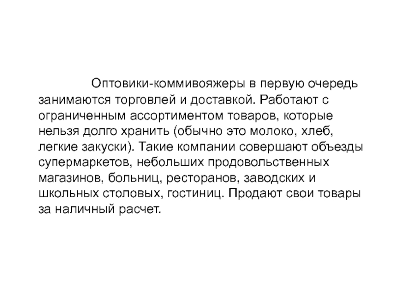 которые нельзя долго хранить (обычно это молоко, хлеб, легкие закуски). Такие компании совершают объезды супермаркетов, небольших продовольственных магазинов, больниц, ресторанов, заводских и школьных столовых, гостиниц. Продают свои товары за наличный расчет.