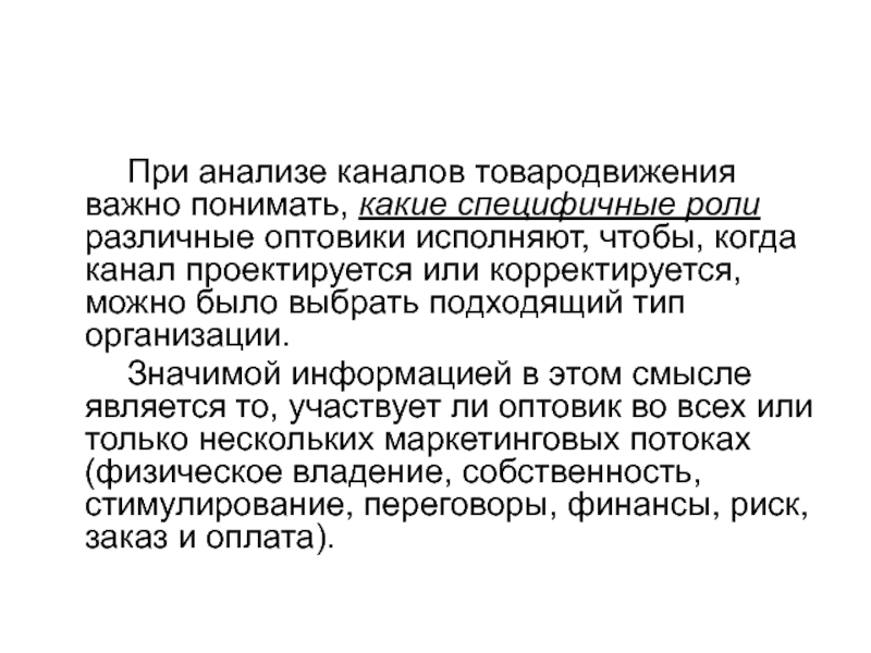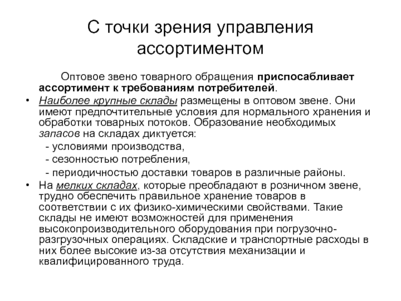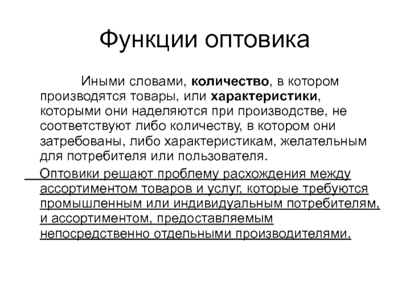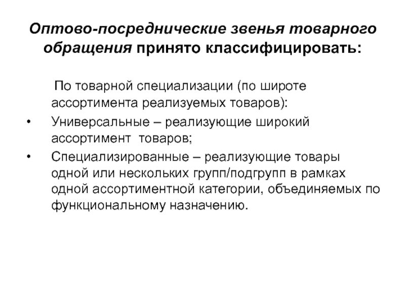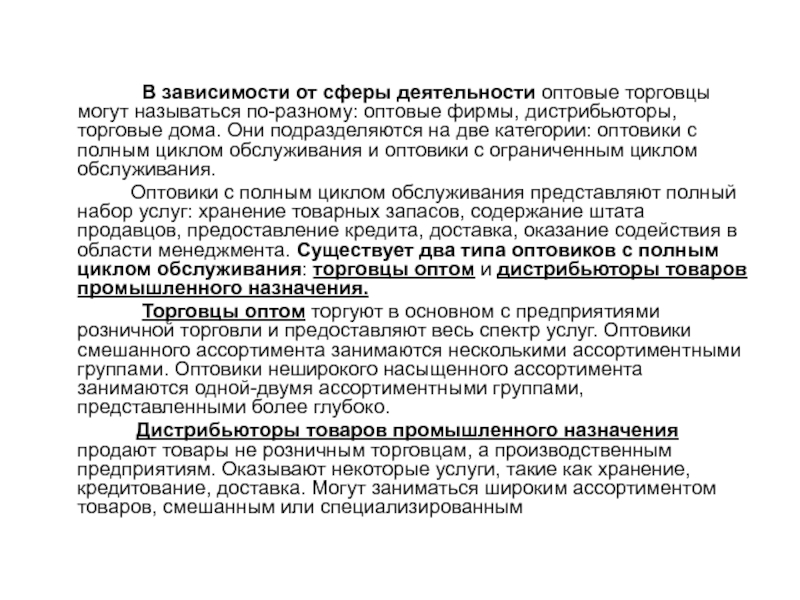 Торговцы оптом торгуют в основном с предприятиями розничной торговли и предоставляют весь спектр услуг. Оптовики смешанного ассортимента занимаются несколькими ассортиментными группами. Оптовики неширокого насыщенного ассортимента занимаются одной-двумя ассортиментными группами, представленными более глубоко.