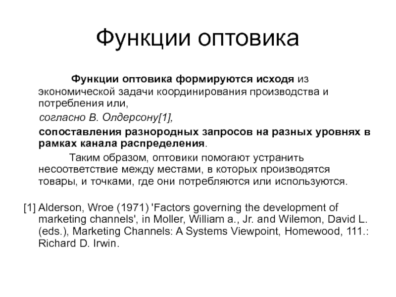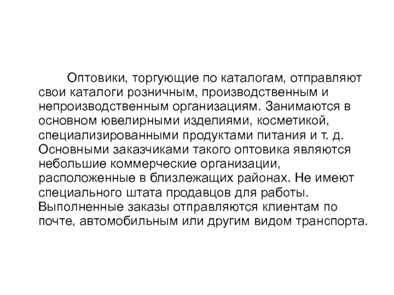 основном ювелирными изделиями, косметикой, специализированными продуктами питания и т. д. Основными заказчиками такого оптовика являются небольшие коммерческие организации, расположенные в близлежащих районах. Не имеют специального штата продавцов для работы. Выполненные заказы отправляются клиентам по почте, автомобильным или другим видом транспорта.