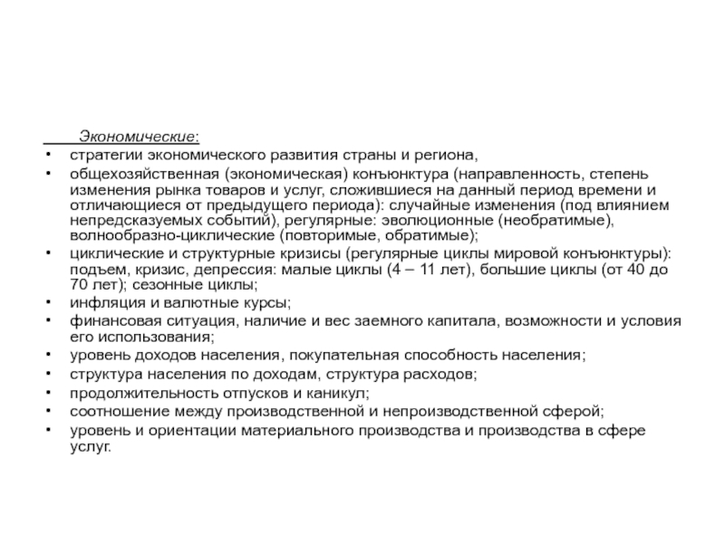 циклические и структурные кризисы (регулярные циклы мировой конъюнктуры): подъем, кризис, депрессия: малые циклы (4 – 11 лет), большие циклы (от 40 до 70 лет); сезонные циклы;