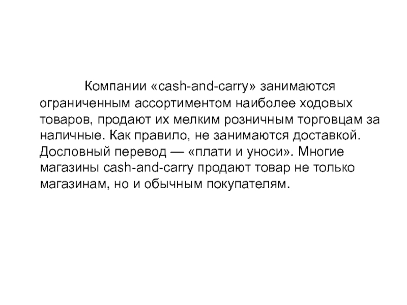 наличные. Как правило, не занимаются доставкой. Дословный перевод — «плати и уноси». Многие магазины cash-and-carry продают товар не только магазинам, но и обычным покупателям.