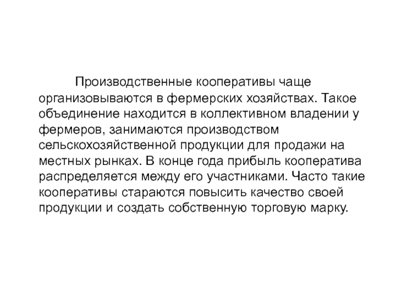 фермеров, занимаются производством сельскохозяйственной продукции для продажи на местных рынках. В конце года прибыль кооператива распределяется между его участниками. Часто такие кооперативы стараются повысить качество своей продукции и создать собственную торговую марку.