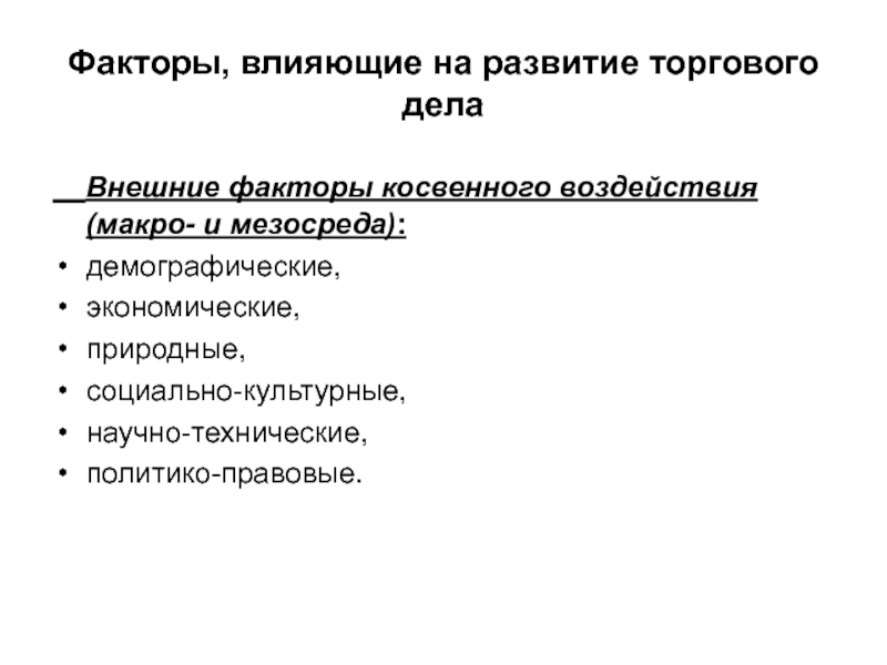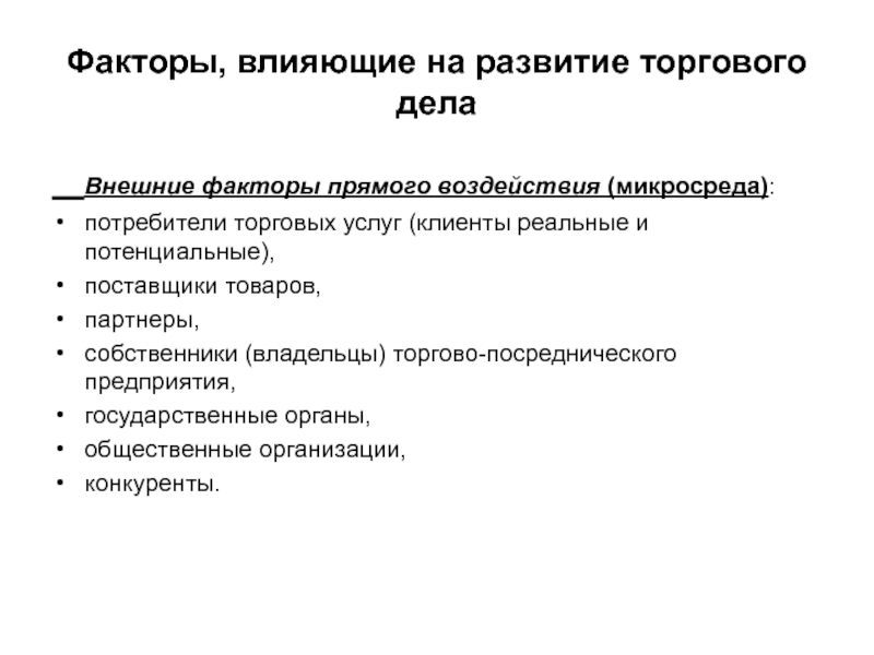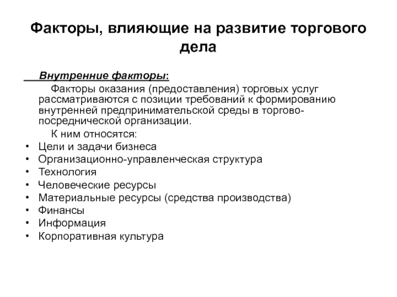 Слайд 2Факторы, влияющие на развитие торгового дела