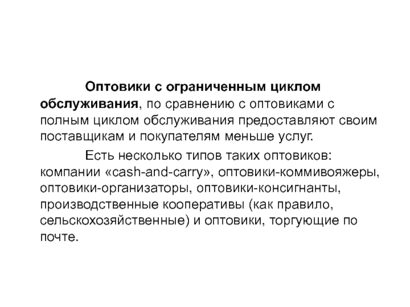 Есть несколько типов таких оптовиков: компании «cash-and-carry», оптовики-коммивояжеры, оптовики-организаторы, оптовики-консигнанты, производственные кооперативы (как правило, сельскохозяйственные) и оптовики, торгующие по почте.