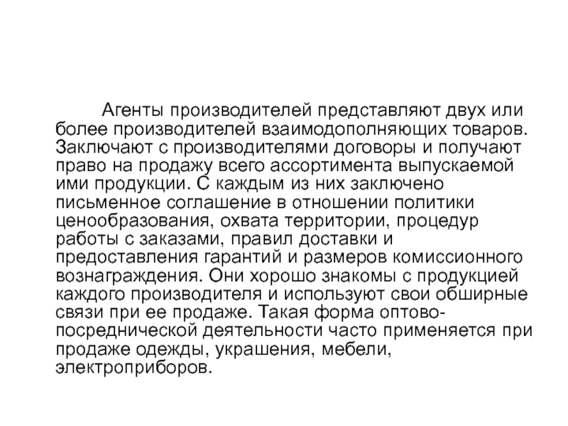и получают право на продажу всего ассортимента выпускаемой ими продукции. С каждым из них заключено письменное соглашение в отношении политики ценообразования, охвата территории, процедур работы с заказами, правил доставки и предоставления гарантий и размеров комиссионного вознаграждения. Они хорошо знакомы с продукцией каждого производителя и используют свои обширные связи при ее продаже. Такая форма оптово-посреднической деятельности часто применяется при продаже одежды, украшения, мебели, электроприборов.