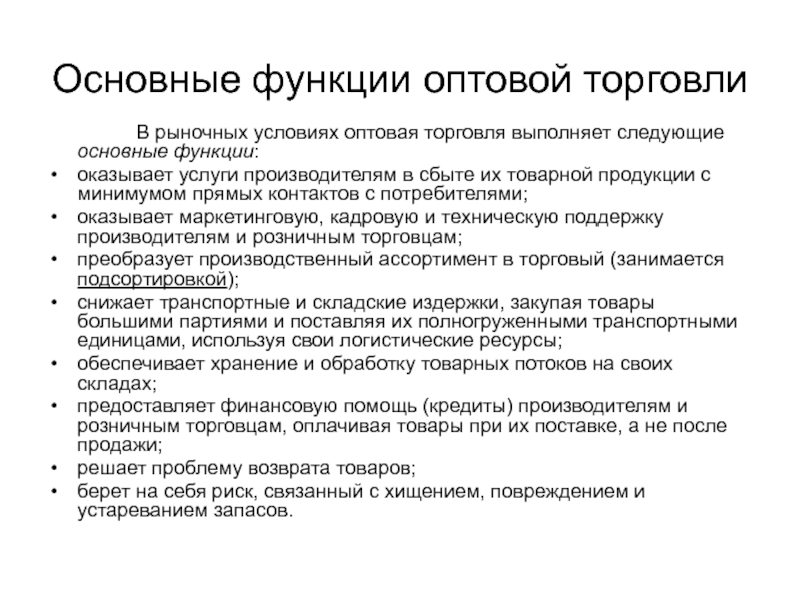 - предприятия оптовой торговли, т.е. специализированные на оптовой торговой деятельности предприятия, осуществляющие полный комплекс закупочно-сбытовых операций с переходом права собственности на товар к оптовому звену (независимые оптовые торговцы);
