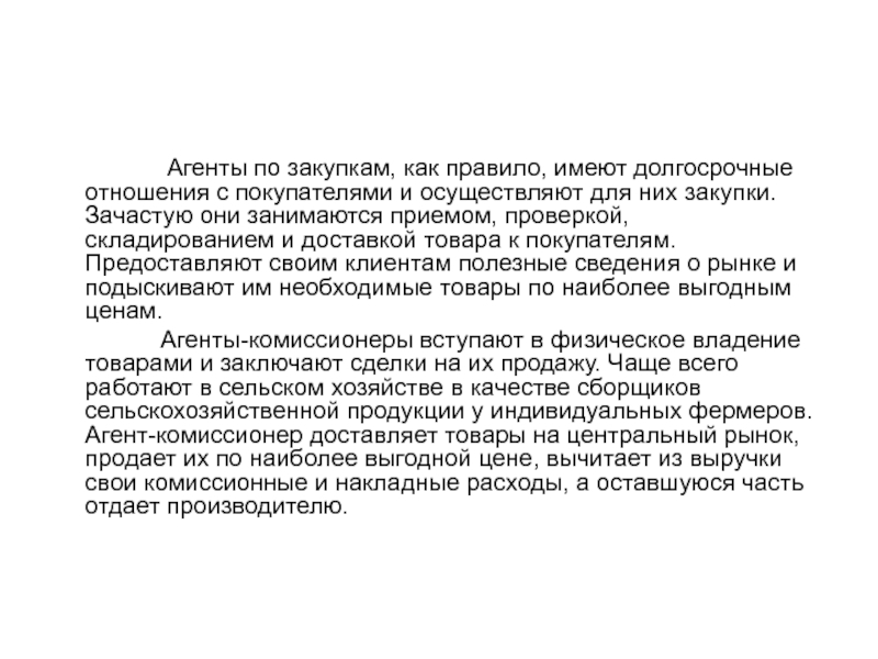 осуществляют для них закупки. Зачастую они занимаются приемом, проверкой, складированием и доставкой товара к покупателям. Предоставляют своим клиентам полезные сведения о рынке и подыскивают им необходимые товары по наиболее выгодным ценам.