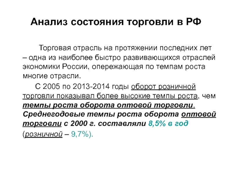 С 2005 по 2013-2014 годы оборот розничной торговли показывал более высокие темпы роста, чем темпы роста оборота оптовой торговли. Среднегодовые темпы роста оборота оптовой торговли с 2000 г. составляли 8,5% в год