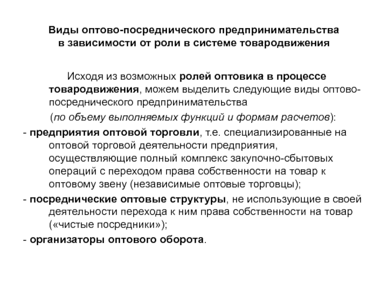 из возможных ролей оптовика в процессе товародвижения, можем выделить следующие виды оптово-посреднического предпринимательства