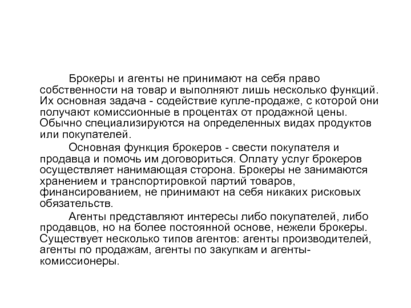лишь несколько функций. Их основная задача - содействие купле-продаже, с которой они получают комиссионные в процентах от продажной цены. Обычно специализируются на определенных видах продуктов или покупателей.