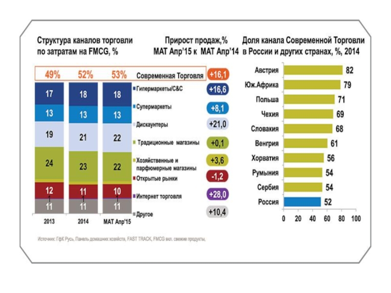 Доля каналов современной торговли в России в целом по стране составляет в настоящее время 52%.