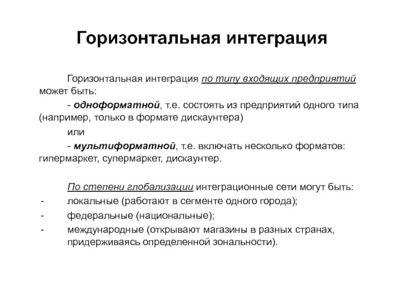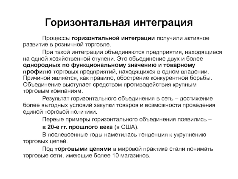 Процессы горизонтальной интеграции получили активное развитие в розничной торговле.