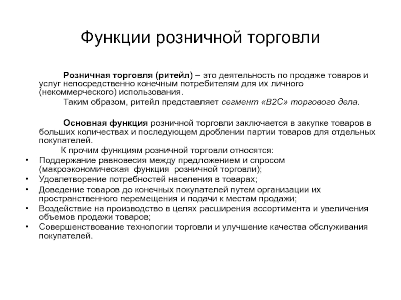 Основная функция розничной торговли заключается в закупке товаров в больших количествах и последующем дроблении партии товаров для отдельных покупателей.