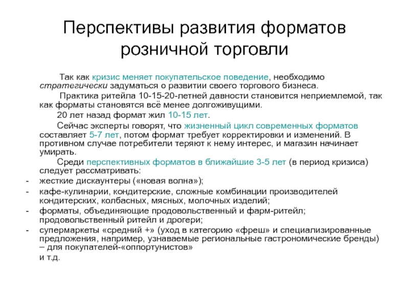 Среди перспективных форматов в ближайшие 3-5 лет (в период кризиса) следует рассматривать: