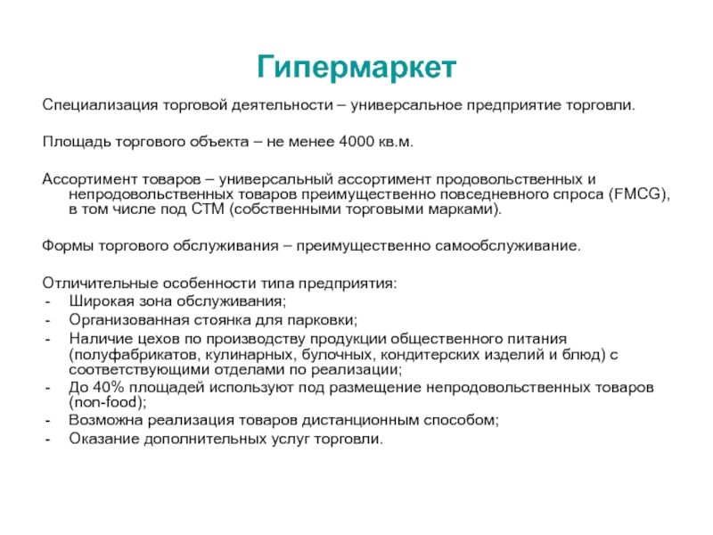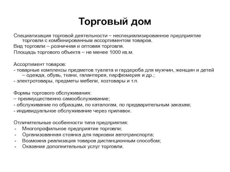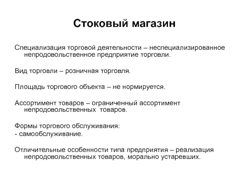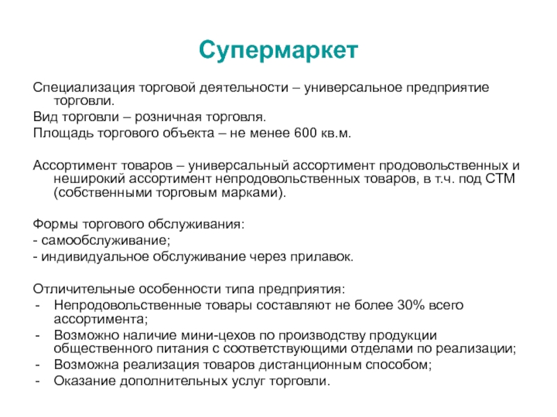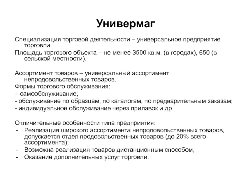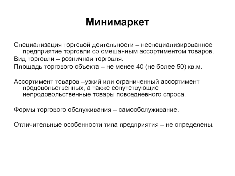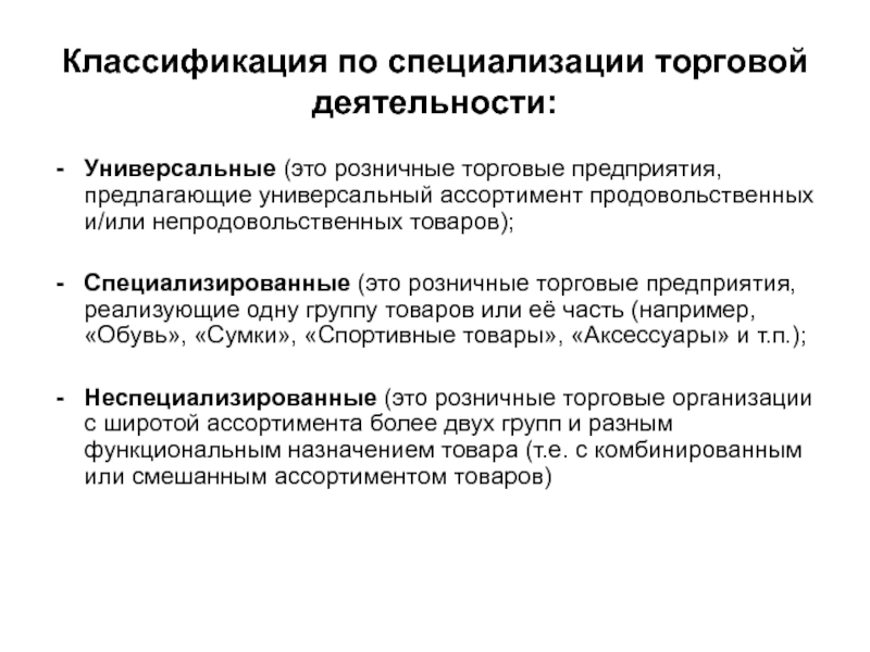Неспециализированные (это розничные торговые организации с широтой ассортимента более двух групп и разным функциональным назначением товара (т.е. с комбинированным или смешанным ассортиментом товаров)