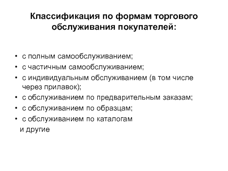Слайд 12Классификация по формам торгового обслуживания покупателей: