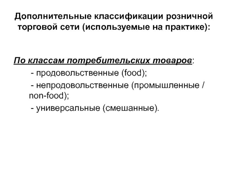Слайд 33Дополнительные классификации розничной торговой сети (используемые на практике):