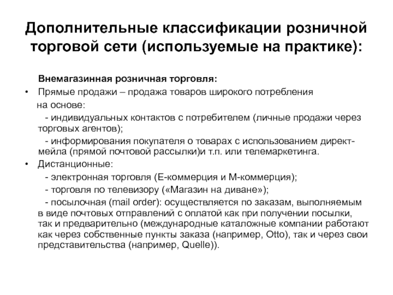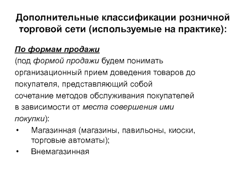 Слайд 31Дополнительные классификации розничной торговой сети (используемые на практике):