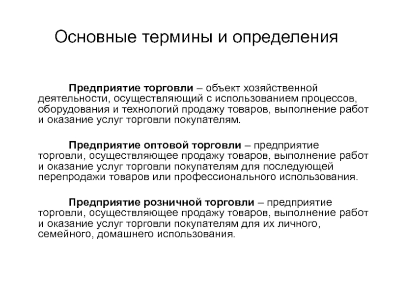 Предприятие оптовой торговли – предприятие торговли, осуществляющее продажу товаров, выполнение работ и оказание услуг торговли покупателям для последующей перепродажи товаров или профессионального использования.