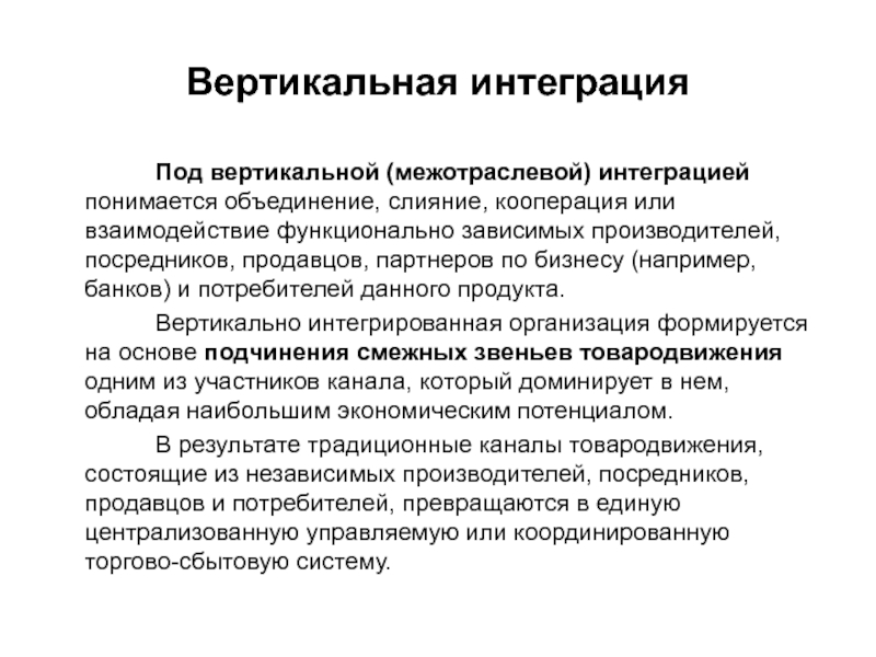 Под вертикальной (межотраслевой) интеграцией понимается объединение, слияние, кооперация или