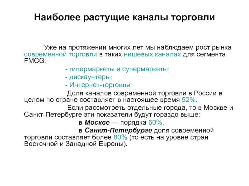 в Санкт-Петербурге доля современной торговли составляет более 80% (то есть на уровне стран Восточной и Западной Европы).