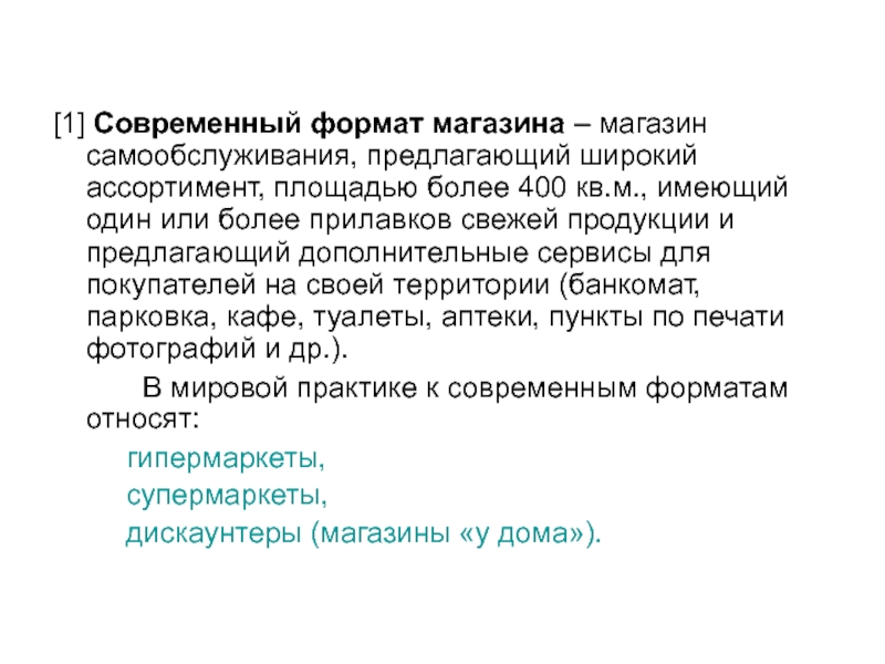 Слайд 16[1] Современный формат магазина – магазин самообслуживания, предлагающий широкий ассортимент,
