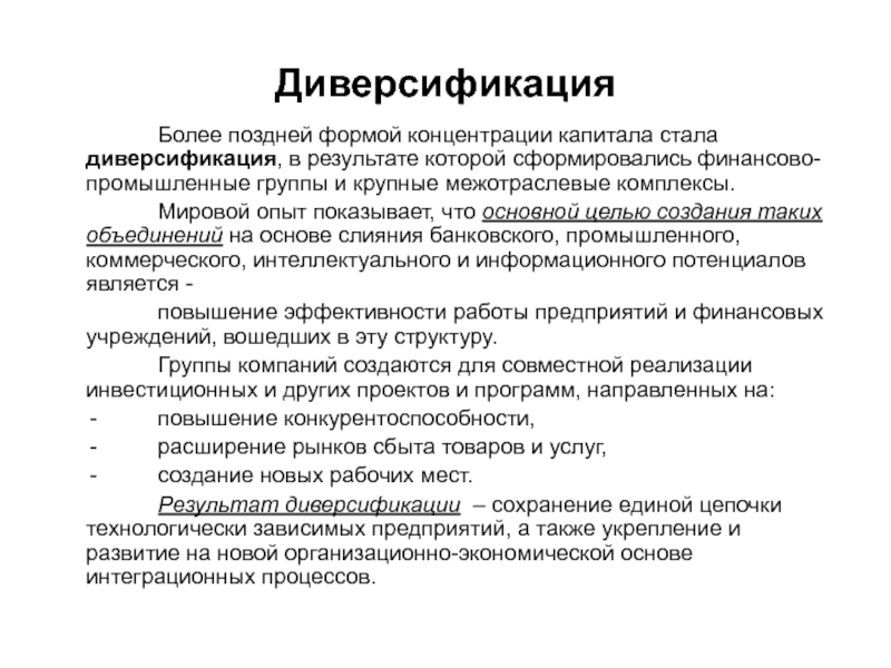 Более поздней формой концентрации капитала стала диверсификация, в результате которой