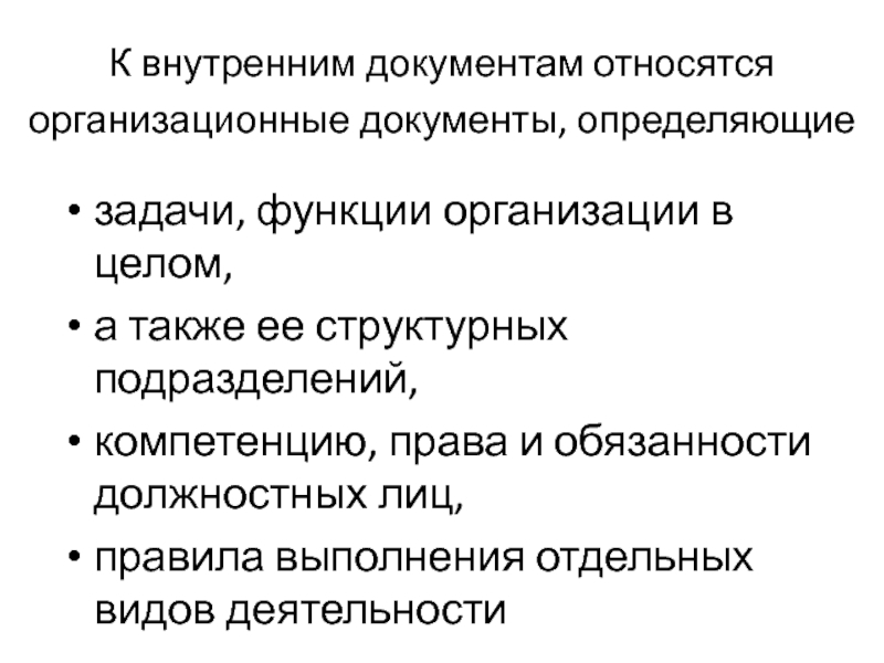 Слайд 29К внутренним документам относятся организационные документы, определяющие