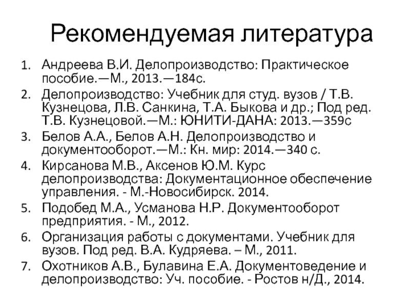 Андреева В.И. Делопроизводство: Практическое пособие.—М., 2013.—184с.