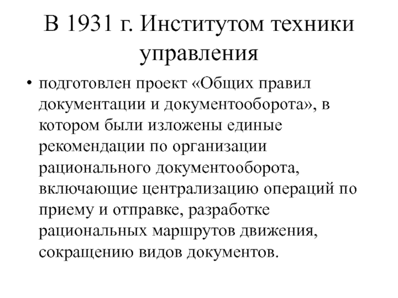 организации рационального документооборота, включающие централизацию операций по приему и отправке, разработке рациональных маршрутов движения, сокращению видов документов.