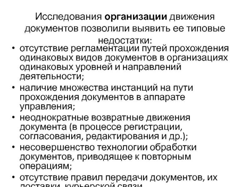 Слайд 10Исследования организации движения документов позволили выявить ее типовые недостатки: