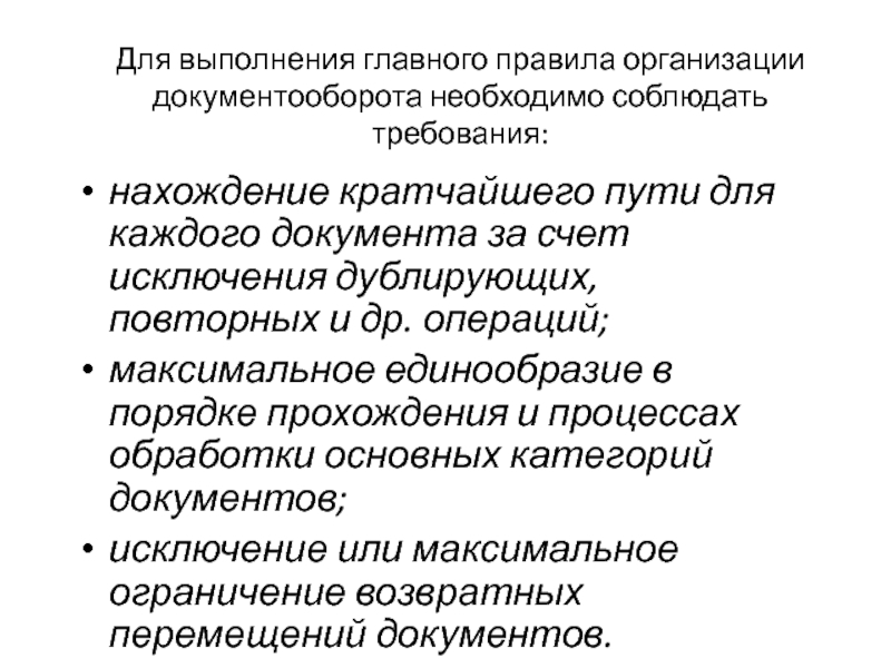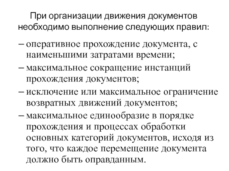 Слайд 13При организации движения документов необходимо выполнение следующих правил: