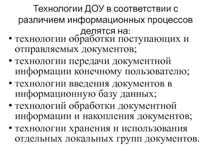 Слайд 5Технологии ДОУ в соответствии с различием информационных процессов делятся на: