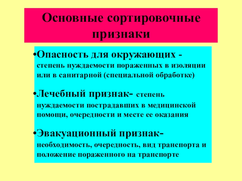 Эвакуационный признак-необходимость, очередность, вид транспорта и положение пораженного на транспорте