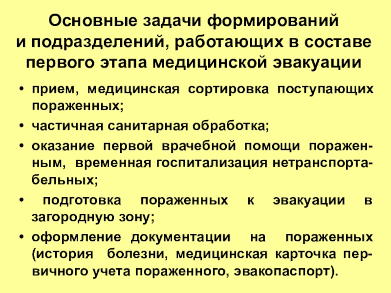 необходимость специальной подготовки пораженных к эвакуации и оказания медицинской помощи в ходе эвакуации.