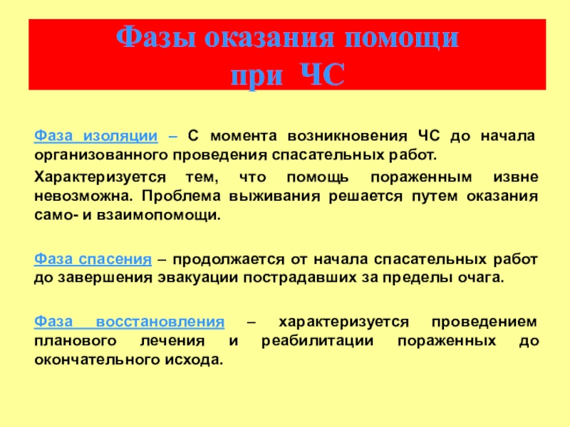 Фаза спасения – продолжается от начала спасательных работ до завершения эвакуации пострадавших за пределы очага.