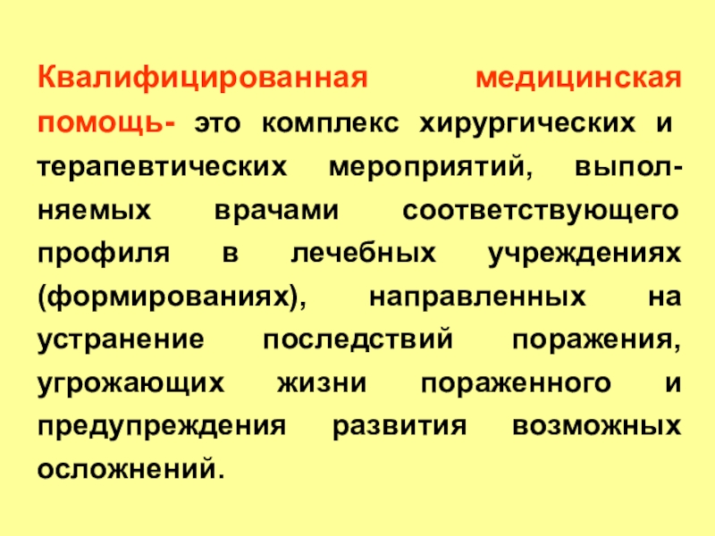 Слайд 14Квалифицированная медицинская помощь- это комплекс хирургических и терапевтических мероприятий, выпол-няемых
