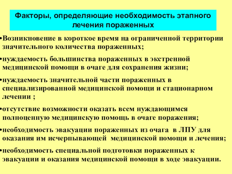 Слайд 6Факторы, определяющие необходимость этапного лечения пораженных