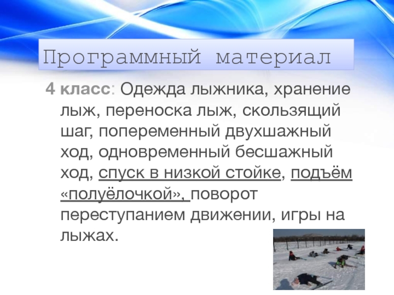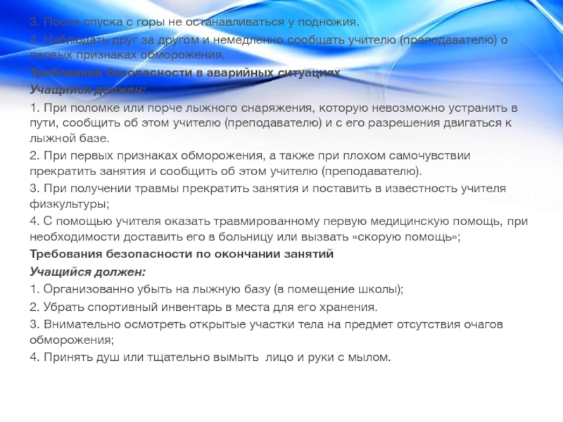 1. Соблюдать интервал при движении на лыжах: на дистанции – 3-4 м, при спуске с горы – не менее 30 м.