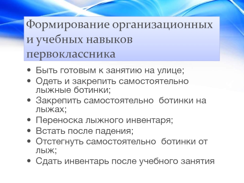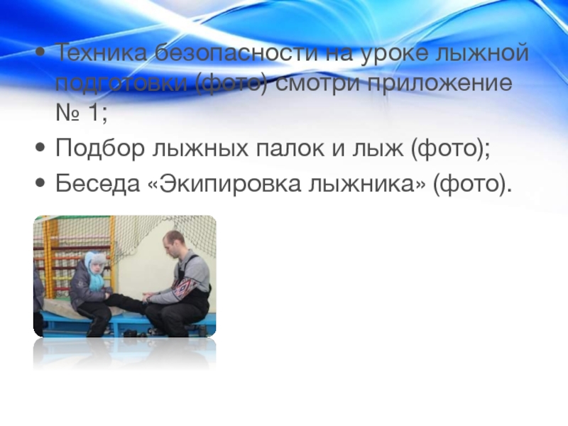 2. Проверить исправность спортивного инвентаря и подогнать крепления лыж к обуви. Во избежание потертостей не надевать тесную или слишком свободную обувь.
