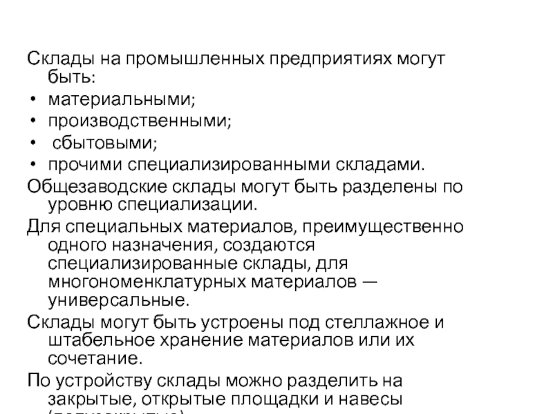 Слайд 10Склады на промышленных предприятиях могут быть: