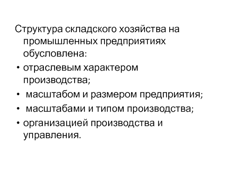 Слайд 11Структура складского хозяйства на промышленных предприятиях обусловлена: