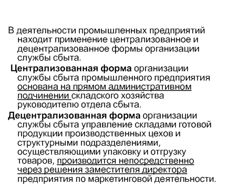 Слайд 23В деятельности промышленных предприятий находит применение централизованное и децентрализованное формы